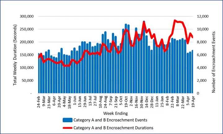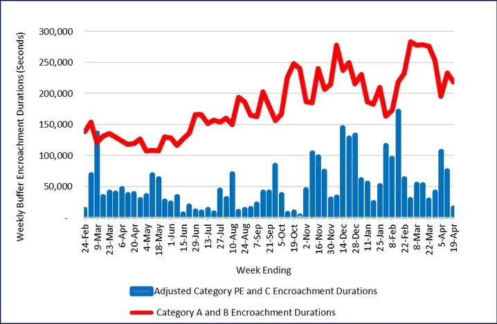 Figure 3 reports the weekly total durations for the two conformance category groupings. The Category PE and C weekly durations bounce around with little long-term trend since we started reporting in February 2024, primarily reflecting week-to-week variations in meteorological conditions and some seasonal variation. Last week the PE and C buffer encroachment durations decreased 79 percent due to better meteorological conditions. Category A and B duration totals for the week ending April 19 dropped six percent from the previous week but remain high. Curiously, the number of Category A and B buffer encroachment events has fallen the past three weeks while total durations remain relatively unchanged, leading to a sharp increase in the encroachment duration per event. The Category A and B encroachment duration per event is now 32.9 seconds, slightly below the high value of 36.7 seconds recorded the previous week. That value was the highest recorded for the past thirteen months.