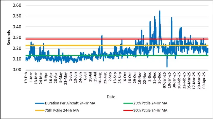Figure 4. Moving Average Hourly Encroachment Duration Per Aircraft From February 18, 2024 Through April 19, 2025