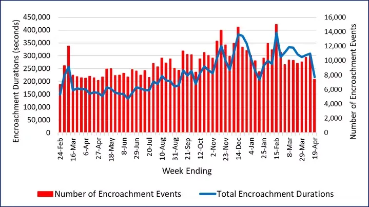 Safety margins decreased significantly over the past thirteen months, with the mean daily encroachment duration for March 2025 fifty-seven percent higher than the March 2024 value and the most severe encroachment durations were twice as high. Based on analysis of previous years, we expected encroachment durations to peak in December, followed by a gradual decline into the summer months. Unfortunately, the mean daily February and March encroachment durations were two of the three highest months for the past year, suggesting that conditions are deteriorating rather than improving. The early April data show only a small improvement. Visual examination of the data suggests that buffer encroachments increased sharply in November 2024 and have since remained at a higher plateau ever since.
