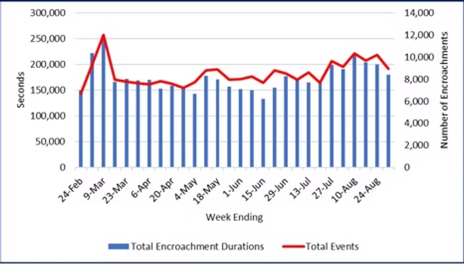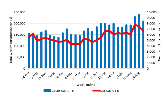 Buffer encroachment durations and event counts fell by about 10 percent last week, although both remained at higher levels than earlier in the summer. The August daily average encroachment duration was 10.5 percent above the July mean, and July in turn was 11.5 percent higher than June. The continued high level of the more severe Category A and B encroachments remains concerning, with the August daily encroachment average 26 percent higher than in June.