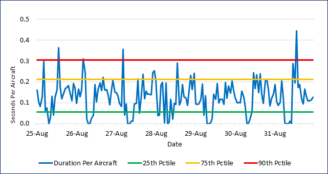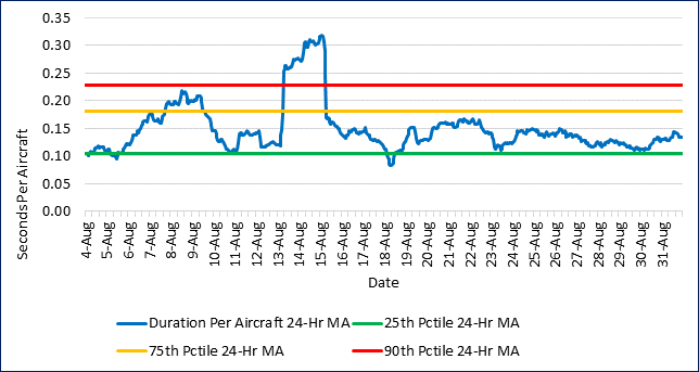 Let’s now take a closer look at safety margins for the seven days ending August 31. Figure 2 displays estimates of encroachment durations per aircraft for each hour over the previous seven days. This offers a detailed look at how safety margins vary over the operating day. Figure 2 also indicates the historical range of the data by showing the 25th, 75th, and 90th percentile values of the duration per aircraft metric. The percentiles were estimated using data from May 2022 through February 2024.