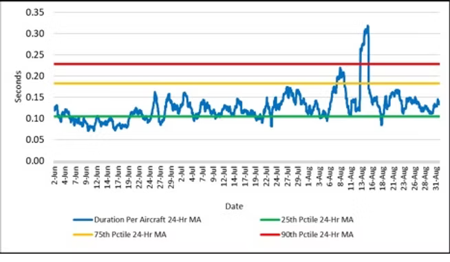 Figure 3 reports the 7-day moving average duration per aircraft for the four weeks from August 4 through August 31, 2024. The chart shows that safety margins over the past month we generally better than the historical average as indicated by the percentile scores, but with two periods of sustained high encroachment durations the weeks of August 3 and August 17. The time series reflects a seasonal pattern in which safety margins are highest during the spring and summer months and slowly degrade starting in late summer, and we are seeing that that general pattern develop with each weekly update.