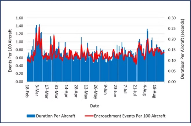 Figure 5. Encroachment Duration Per Aircraft and Event Rates for February 18, 2024 through August 31, 2024