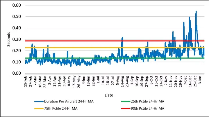 Figure 3 reports the 24-hour moving average encroachment duration of all conformance categories per aircraft for the past three months. Figure  also indicates the historical range of the data by showing the 25th, 75th, and 90th percentile values of the duration per aircraft metric. The percentiles were estimated using data from May 2022 through February 2024.