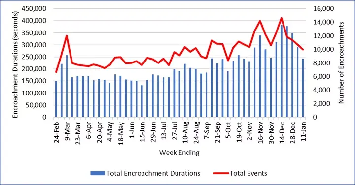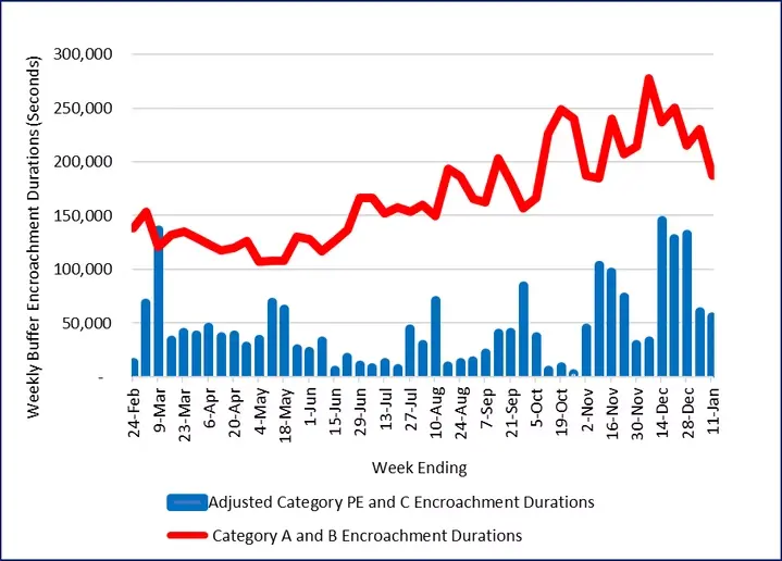 Safety margins improved for the fourth consecutive week, with the first two weeks in January showing a much-welcome improvement over the poor numbers for December. Mean daily encroachment durations for January are running one-third below the daily December average. The more severe category A and B encroachment duration daily average is nineteen percent below the December average during the first two weeks of January.