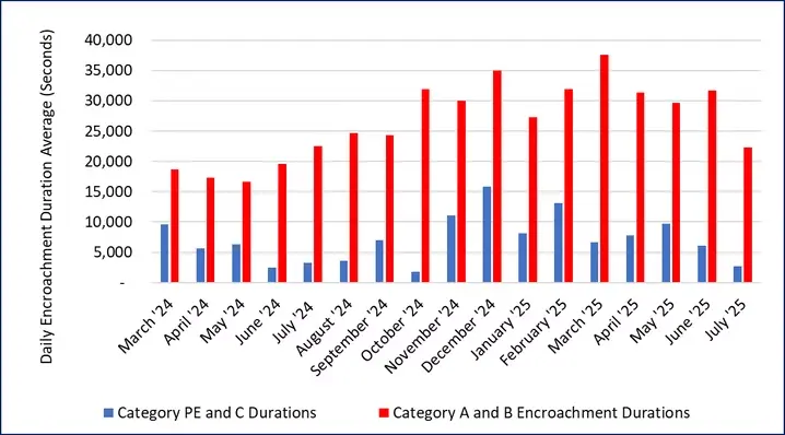 In previous years, Category A and B buffer encroachments would peak in the winter months and they gradually decline. For most of 2025, however, the decline was modest and Category A and B mean daily encroachment durations for April 1 through July 26 were 55 percent higher than the same period one year ago. That number has improved over the past month and a half, so the trend may be improving.