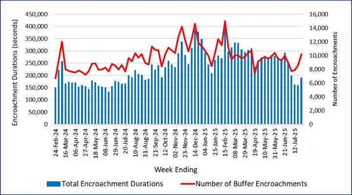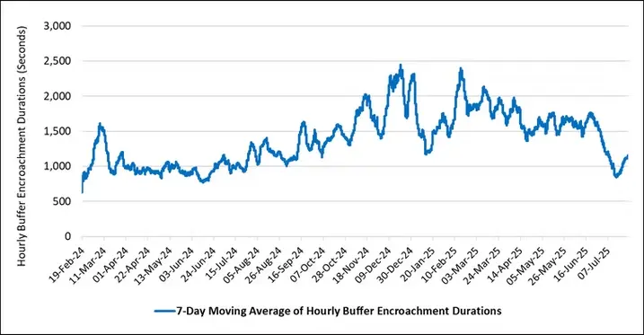 It is only in the past month and a half that we observe a sustained, significant decrease in the buffer encroachment trend since early April 2025. Until the rise the past week and a half, the metric had been at its lowest value since June of 2024. The 7-day moving average of hourly encroachment durations rose steadily over the past 11 days, increasing 33 percent during that short time period.