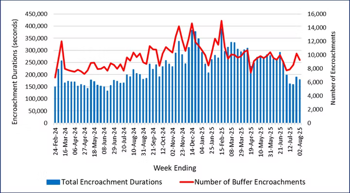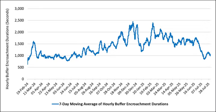 It is only in the past month and a half that we observe a sustained, significant decrease in the buffer encroachment trend since early April 2025. Until the rise the past week and a half, the metric had been at its lowest value since June of 2024. The 7-day moving average of hourly encroachment durations dropped during the past week, after rising steadily over the previous two weeks.