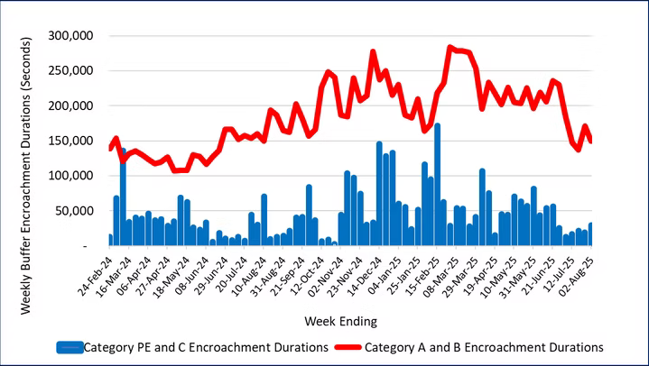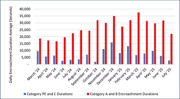 In previous years, Category A and B buffer encroachments would peak in the winter months and they gradually decline. For most of 2025, however, the decline was modest and Category A and B mean daily encroachment durations for April 1 through August 2 were 55 percent higher than the same period one year ago. July was a good month for safety margins, however, as the daily mean encroachment duration fell 34 percent, getting the metric down to a value more typical for midsummer.