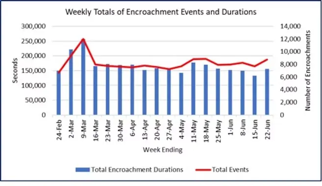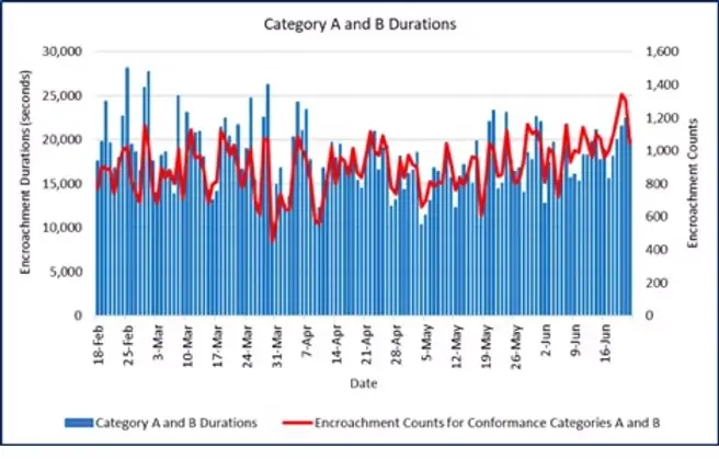 Figure 8. Encroachment Durations and Event Counts for Conformance Categories A and B February 18, 2024 through June 22, 2024