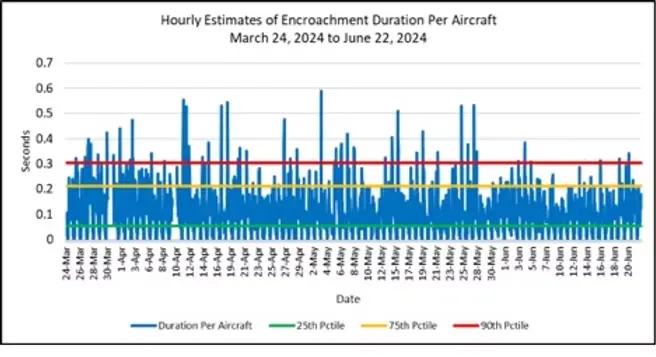 Figure 3 shows duration per aircraft for the four weeks from May 26 through June 22, 2024. With the updated percentile estimates we can observe more periods with encroachment durations above the 90th percentile, although the number remains a low fraction of all observations.