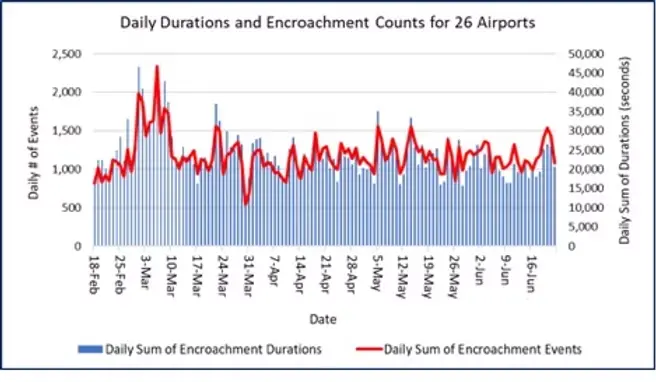 We wrap-up this week’s report with updates to the two charts presented in the previous weekly reports. Figure 7 shows the total daily counts of the number of encroachments and their durations across the 26 airports in the 17 metropolitan areas that we monitor. The blue bars report estimates of total daily encroachment durations divided by the number of aircraft in the terminal airspace (approximately 50 miles of the airport center) for all 17 terminal airspaces. The red line reports the daily number of encroachment events per 100 aircraft.