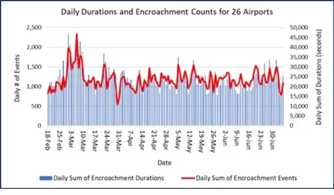 We wrap-up this week’s report with updates to the two charts presented in the previous weekly reports. Figure 7 shows the total daily counts of the number of encroachments and their durations across the 26 airports in the 17 metropolitan areas that we monitor. The blue bars report estimates of total daily encroachment durations divided by the number of aircraft in the terminal airspace (approximately 50 miles of the airport center) for all 17 terminal airspaces. The red line reports the daily number of encroachment events per 100 aircraft. The drop in encroachment events and durations on July 4 is obvious and is attributable to the lower number of flights for the Independence Day holiday.