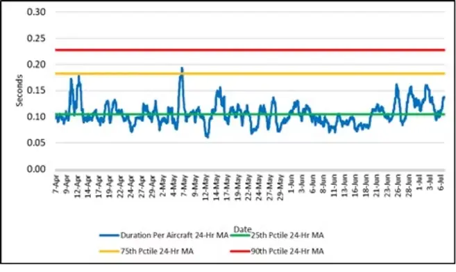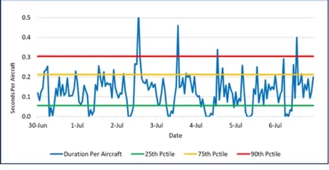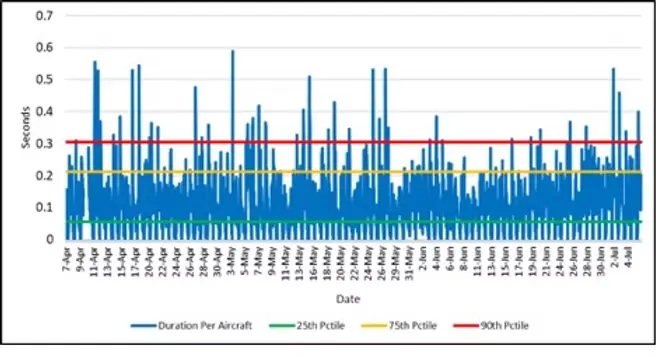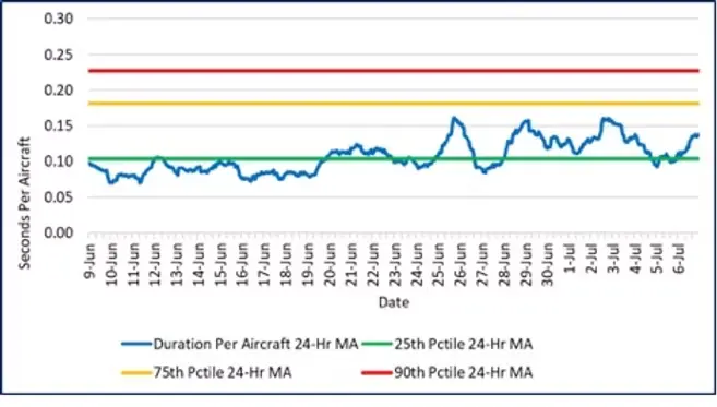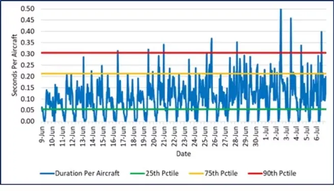 Figure 3 shows duration per aircraft for the four weeks from June 9 through July 6, 2024. Over this longer time period the increased durations for the past two weeks are noticeable. However, even with a few more periods with encroachment durations above the 75th and 90th percentiles, the number remains a low fraction of all observations.