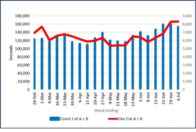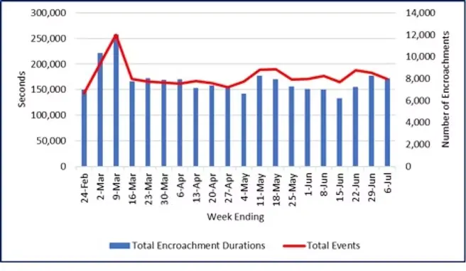 Figure 8. Weekly Encroachment Durations and Event Counts for Conformance Categories A and B February 24, 2024 through July 6, 2024