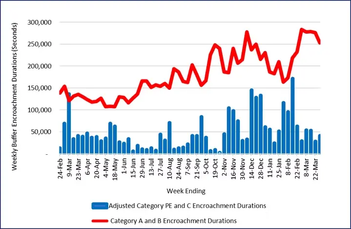 The Weekly Safety Report uses buffer encroachment events and durations to measure changes in safety margins. Safety margins remained low last week, as the risk metrics shows little change from their high levels of the past several months. Total encroachment durations decreased 3.3 percent, while the number of encroachment events increased 2.4 percent. Duration per encroachment event remained high at 30 seconds. The more severe Category A and B separation conformance deviations fell slightly but remain high.