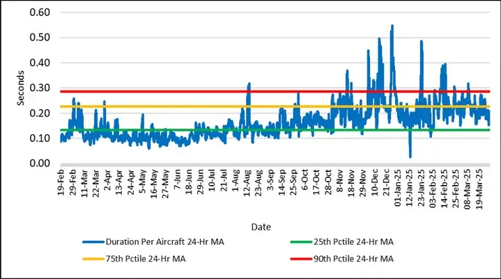 Figure 4 reports the 24-hour moving average encroachment duration per aircraft of all conformance categories since February 2024. Figure 4 also indicates the historical range of the data by showing the 25th, 75th, and 90th percentile values of the duration per aircraft metric. The percentiles were estimated using data from May 2022 through February 2024.