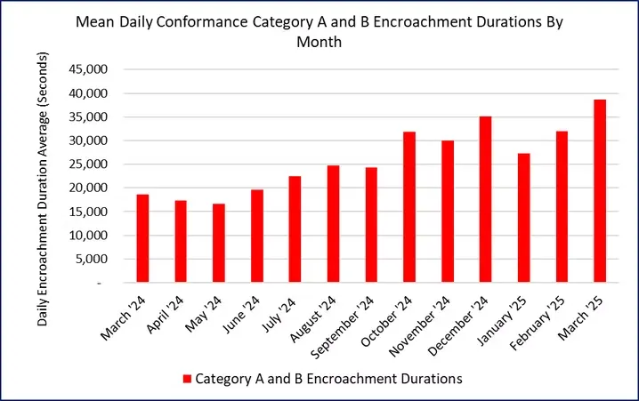 Figure 1. Mean Daily Encroachment Durations for Conformance Category A and B Deviations By Month