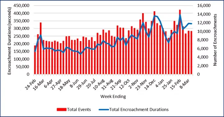 There was no improvement in safety margins last week as they remain near their lowest levels of the past year. Buffer encroachments have been high since November, with only a brief respite from the poor risk metrics in January. Safety margins decreased significantly over the past twelve months. The mean daily encroachment duration for the first half of March 2025 is 66 percent higher than the March 2024 value. Based on analysis of previous years, we expect encroachment durations to peak in December, then gradually decline through the summer months. Unfortunately, the mean daily February and March encroachment durations are the second and third highest months for the past year, suggesting that conditions are deteriorating rather than improving. The data suggest that the NAS is showing signs of stress similar to the winter of 2022-2023, and the recent incidents are consistent with that degradation in safety margins.