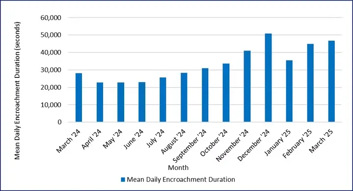 Figure 4. Moving Average Hourly Encroachment Duration Per Aircraft From February 18, 2024 Through March 15, 2025