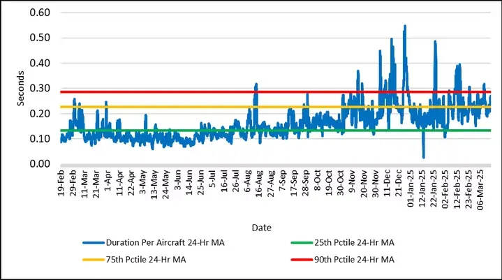 Figure 4 reports the 24-hour moving average encroachment duration per aircraft of all conformance categories since February 2024. Figure 4 also indicates the historical range of the data by showing the 25th, 75th, and 90th percentile values of the duration per aircraft metric. The percentiles were estimated using data from May 2022 through February 2024.