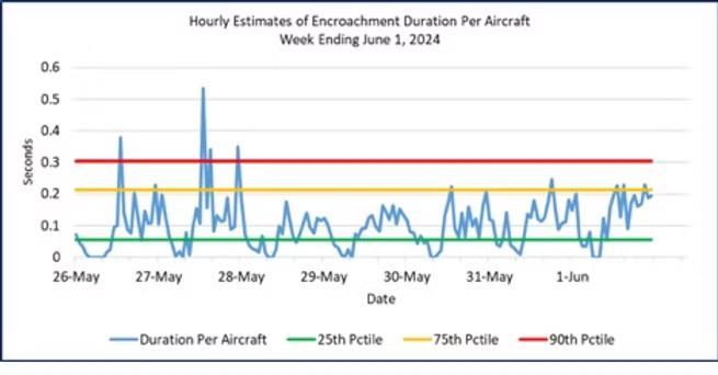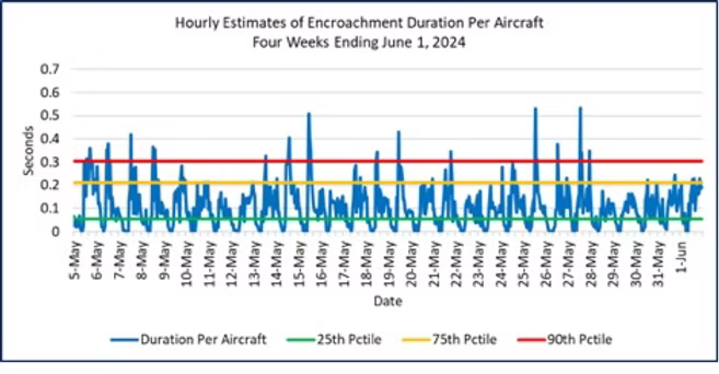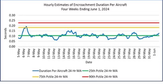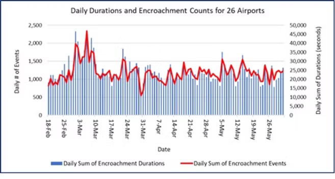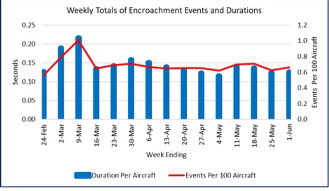 Weekly Safety Margin Update. Safety margins were stable during the past week. Total encroachment durations for the week ending June 1 were 3.1 percent lower than the previous week, and encroachment events increased slightly by 0.5 percent. For the entire month of May, average weekly encroachment durations and event rates were 10 percent above the April average. These changes can be easily seen in Figure 1 that displays weekly summary metrics for the 26 monitored airports.