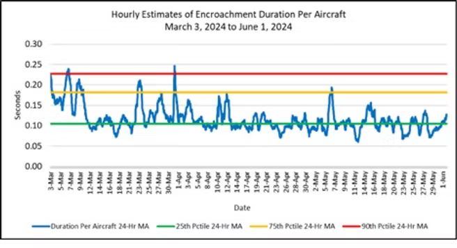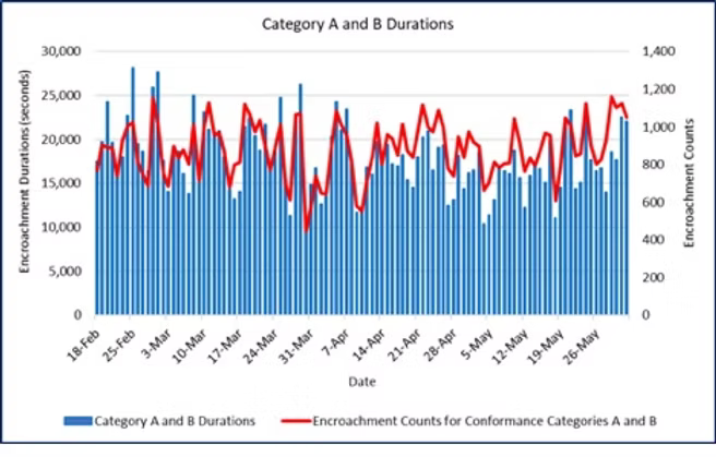 Figure 8 displays information on the most severe separation conformance categories. The daily durations and event counts for the sum of Category A and B encroachments are shown in Figure 7. The pattern differs from the Figure 1, as there is no strong trends during the time period. This suggests that Category PE and C encroachments are affected by different factors from Category A and B. We will take a deep dive into those differences in a future weekly report.