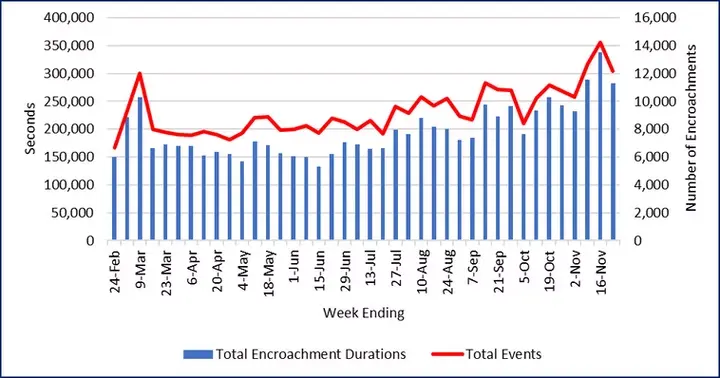 Safety margins improved slightly last week, partially reversing the negative trends from the previous two weeks. Daily encroachment durations for November are nine percent below the October daily average. That is a welcome improvement, but recall that the October daily average is the highest since we began reporting in February 2024.
