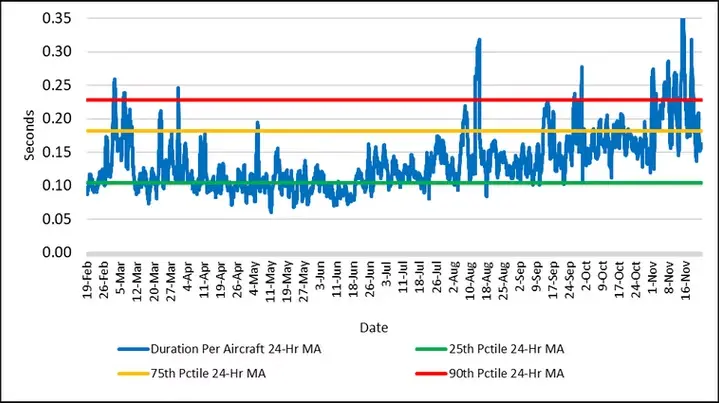 Figure 3 reports the 7-day moving average encroachment duration of all conformance categories per aircraft for the past three months. Figure 3 also indicates the historical range of the data by showing the 25th, 75th, and 90th percentile values of the duration per aircraft metric. The percentiles were estimated using data from May 2022 through February 2024.