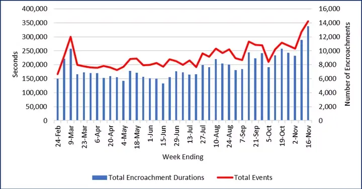 The chart shows a deterioration in safety margins since August. Average daily encroachment durations in November are running 31 percent above the daily October average. The October daily average was 8.9 percent higher than the September average, which was also 8.9 percent above the August average. Daily encroachment durations were 10.2 percent higher in August than in July, and the July average was 16.4 percent higher than the June daily average. Average daily durations have now increased for six consecutive months, with the October daily average 48 percent higher than in April. The first half of November continues the negative trend.