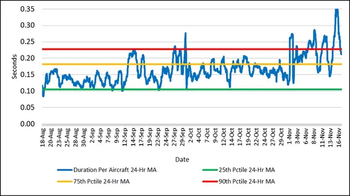 The long-term trends are even more obvious is Figure 4, which shows the 24-hour moving average for daily encroachment event rates and durations per aircraft across the 26 airports in the 17 metropolitan areas that we monitor. The upward trend in average encroachment durations since June is readily apparent. Last week’s metrics confirmed that the big jump in the first days of November were a significant step-up in the level of buffer encroachments.
