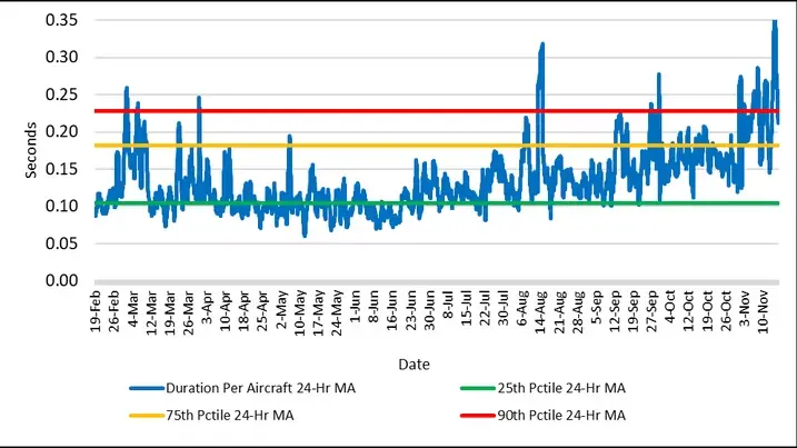 Figure 3 reports the 7-day moving average encroachment duration of all conformance categories per aircraft for the past three months. Figure 3 also indicates the historical range of the data by showing the 25th, 75th, and 90th percentile values of the duration per aircraft metric. The percentiles were estimated using data from May 2022 through February 2024.