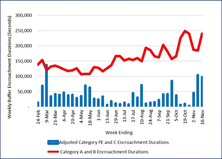 Figure 2. Weekly Trends in Encroachment Durations By Separation Conformance Category