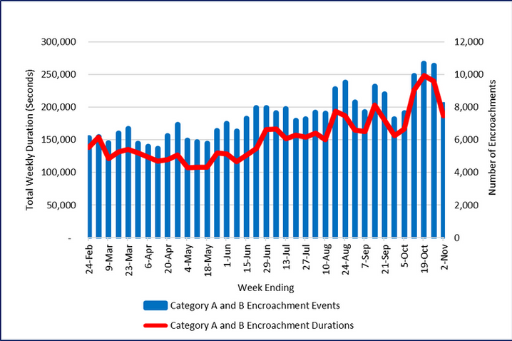 The chart shows a deterioration in safety margins since August. Average daily encroachment durations in October were 8.9 percent higher than the September average, which was also 8. percent above the August average. Daily encroachment durations were 10.2 percent higher in August than in July, and the July average was 16.4 percent higher than the June daily average. Average daily durations have now increased for five consecutive months, with the October daily average 48 percent higher than in April. The time series reflects a seasonal pattern in which safety margins are highest during the spring and summer months and slowly degrade starting in late summer. We are seeing that recurring pattern continue as we move into the autumn months.