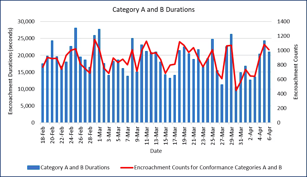 Figure 2. Encroachment Durations and Event Counts for Conformance Categories A and B