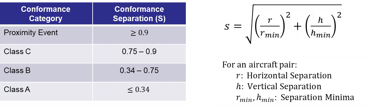 For the Aviation Safety Monitor, we identify encroachment events under different meteorological conditions according to the Separation Index methodology described by the FAA in its Air Traffic Quality Assurance document [1]. The Separation Index formula, defined in Figure 2, classifies Separation Conformance into four categories that measure the degree of deviation from the separation standard. Separation Conformance is measured by the index S: a value of 1.0 or higher indicates conformance with the standards. A value below 1.0 shows non-conformance, with the degree of non-conformance classified into four categories: Proximity Event, Class C, Class B, and Class A as defined in the table reported in Figure 2.